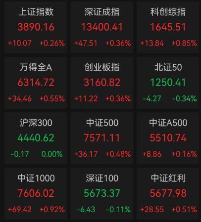 截至收盘,上证指数涨0.26%,报3890.16点;深证成指涨0.36%,报13400.41点;创业板指涨0.36%,报3160.82点;科创综指涨0.85%,报1645.51点。沪深两市成交额约16143.95亿元,较前一个交易日缩量约421.13亿元。