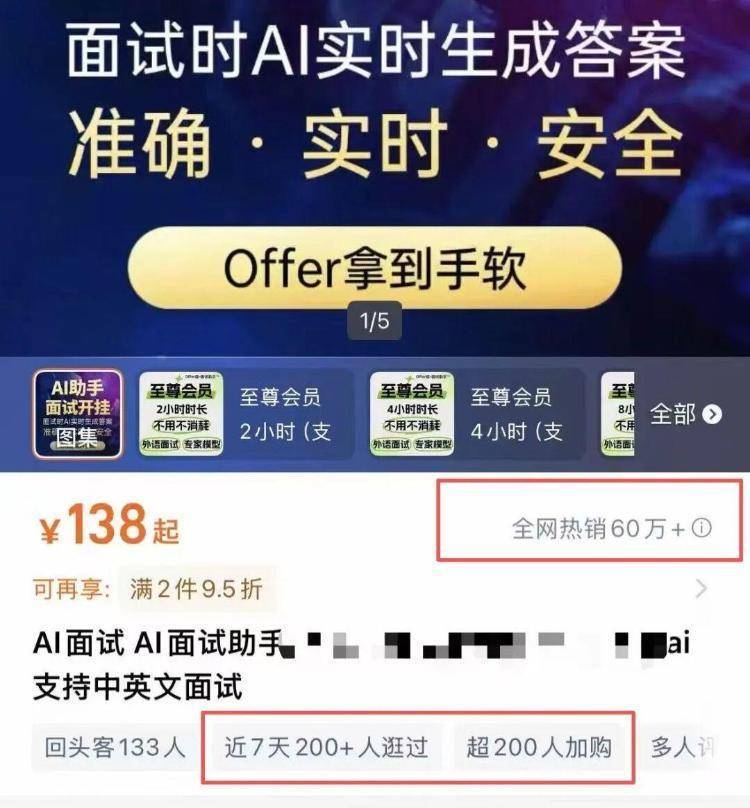 以某网店一款AI面试助手为例,该产品按时长计费,最低档价位138元,可使用时长为2小时,近七天200+人逛过,超200人加购,商品详情页面显示产品全网热销(即同款产品过去365天销量)60万+。