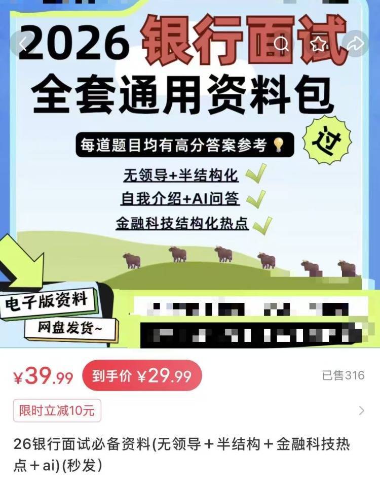 某网店的商品页面展示了多家银行“历年真题”“答题思路”“必看题目”,其中一款银行面试全套通用资料包,涵盖无领导小组、半结构化面试、AI面试、金融科技热点等,售价几十元,商品评价300+,有消费者反馈“内容非常详细,知识覆盖面广”“适合考前突击”。
