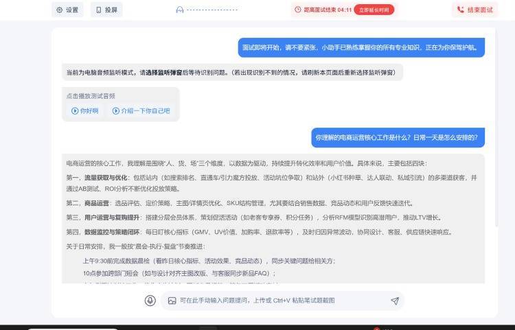 记者试用了一款产品,打开客服发来的网页链接即可使用。进入页面后选择需要面试的岗位,可上传简历,选择“在本电脑面试”后,根据提示分享系统音频,面试助手会实时识别电脑中面试官的问题,并结合简历给出参考答案。客服介绍称,如果面试要求共享屏幕,也可以将面试同步投屏到手机或平板上看答案。
