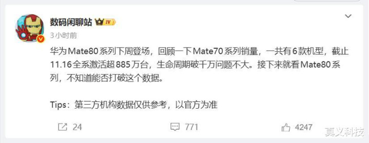 至于Mate70系列的销量,如下图所示离破千万台还差一点距离。至此,华为受制裁后Mate系列出货主力为双数机型的规律大致就形成了,所以Mate80系列会迎来销量奇迹吗?