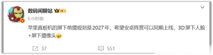 另外,该博主今天再给出苹果屏下摄像头更准确的消息,其透露:“苹果直板机的屏下前摄规划是2027年,希望安卓阵营可以同期上线,3D屏下人脸+屏下摄像头。”