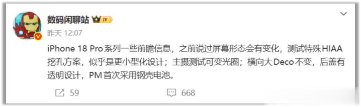 不过数码闲聊站对这一说法做修正,近日通过微博表示:“iPhone 18 Pro系列一些前瞻信息,之前说过屏幕形态会有变化,测试特殊HIAA挖孔方案,似乎是更小型化设计;主摄测试可变光圈;横向大Deco不变,后盖有透明设计,PM首次采用钢壳电池。”