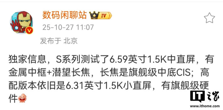 IT之家10月27日消息,据博主@数码闲聊站今日爆料,某厂S系列测试了6.59英寸1.5K中直屏,有金属中框+潜望长焦配资行业四大巨头,长焦是旗舰级中底CIS;高配版本依旧是6.31英寸1.5K小直屏,有旗舰级硬件。